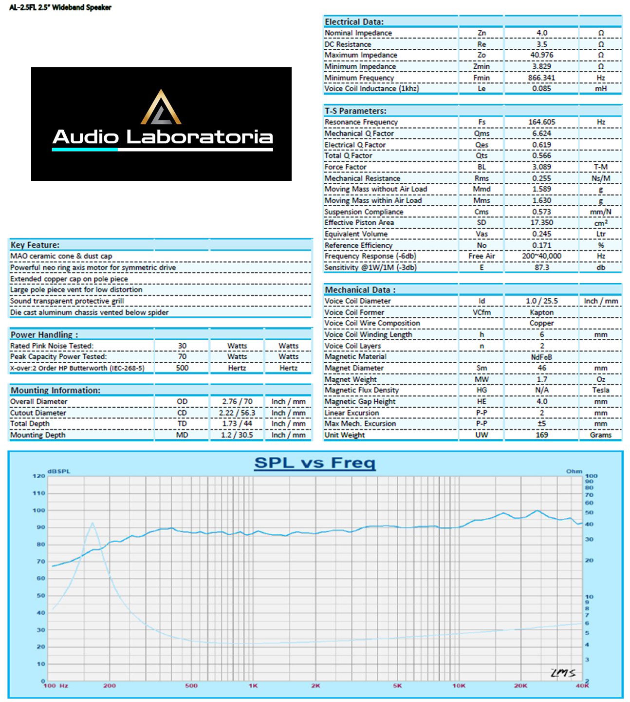 2.5インチハイエンドフルレンジスピーカー「AL-2.5FL」の完成された音質を一般的な3.5インチサイズでピラー等に取付可能なバックチャンバー一体型仕様です。